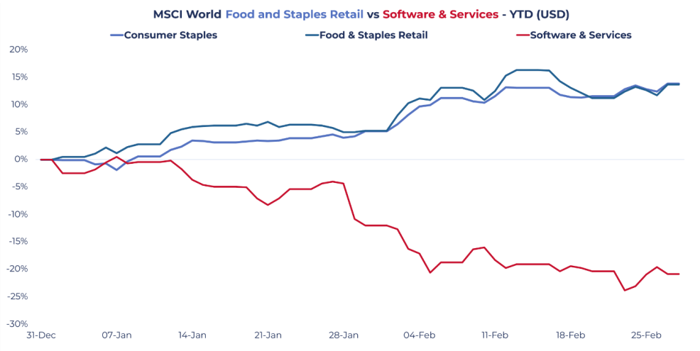 Equity markets saw a notable shift in leadership as investors rotated away from Growth and areas with large intangible asset bases towards Value and businesses with more tangible assets. This has been beneficial for the Fund's Consumer Staples holdings, whose stable demand and defensive earnings profiles lie behind our overweight exposure. The contrast in returns between Staples and Software encapsulates much of this year's equity market narrative.