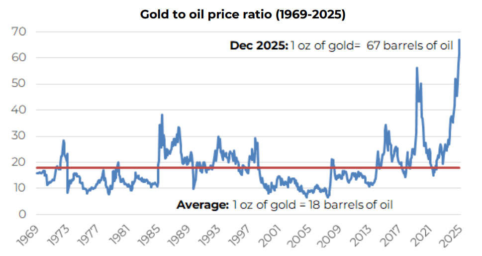 Another way to think about the relative value of oil is to compare its price to that of another real asset, gold. Over the last 55 years, one ounce of gold has bought, on average, just under 18 barrels of oil. Oil became comparatively expensive in the early 2000s, when this ratio fell to around 10 barrels of oil. Following the COVID volatility of the early 2020s, we have seen a sharp increase in the gold price that has not been matched by oil. As a result, one ounce of gold now buys around 67 barrels of oil, the most significant relative value of oil versus gold over this period. Should the relationship return to the long-run average, and the gold price stayed flat, it would imply an oil price today of around $240/bl.