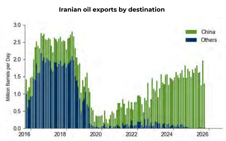 - Oil exports from Iran, currently around 1.5m b/day (flat year-on-year), flow almost exclusively to China, often via ship-to-ship transfers and blending hubs (e.g. Malaysia) to mask their origin. During Autumn 2025, there has been a significant buildup of ‘oil on water’, meaning oil in transit or storage offshore. According to Kpler, much of this oil comes from Iran, and is struggling to find a home as China’s appetite becomes more muted. Prospects for Iranian oil exports in 2026 depend on how hawkish the US administration is prepared to be.
