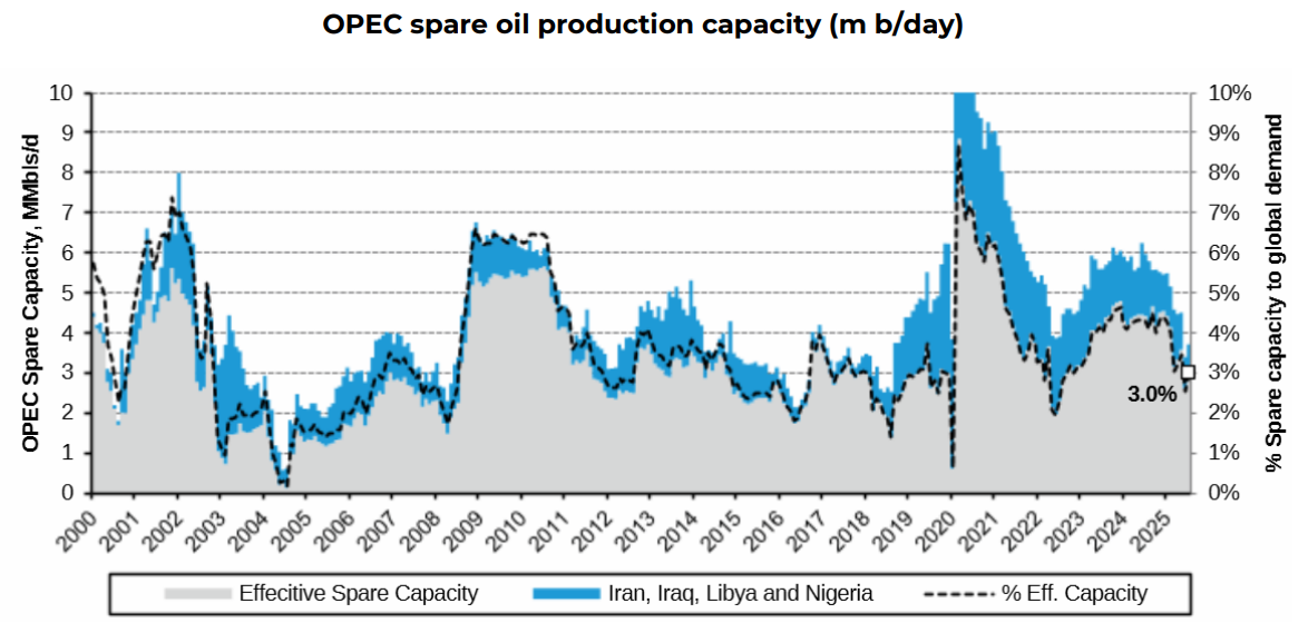 One of the key overhangs in the oil market at the start of 2025 was the elevated level of OPEC's spare production capacity. Depending on the view of capacity effectiveness in certain countries, spare capacity in early 2025 ranged from 4.5% to 5.5% of global oil demand, versus the long-term norm of around 3-3.5%. With OPEC increasing its quotas in 2025 by around 2.5m b/day, spare capacity has fallen to around 3%, in line with long-term averages.