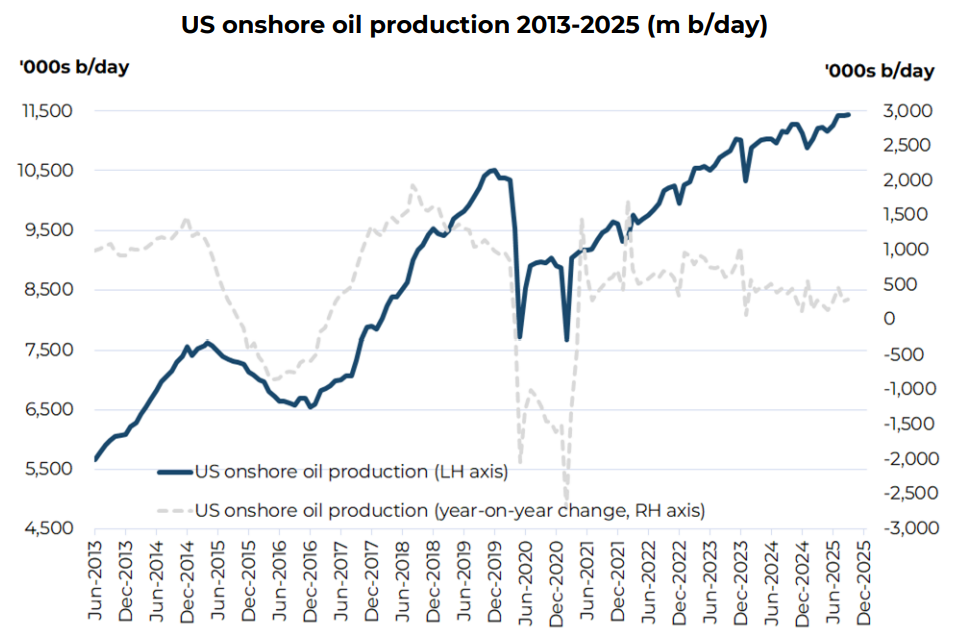 For much of the last decade, growth in the US shale industry had kept global oil markets well supplied. Latest data from the Energy Information Administration (EIA) for September 2025 confirmed production of 11.4m b/day, well surpassing the pre-COVID peak (November 2019) of 10.5m b/day and implying around 0.25m b/day growth on average from 2024 levels.
