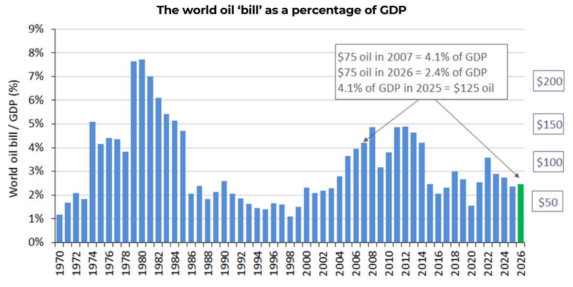 The “affordability” of oil is a driver of demand, and globally, we believe that oil remains a cheap commodity. Based on a Brent oil price of around $75/bl in 2026, we calculate that the world would spend around 2.4% of GDP on oil, below the 30-year average of around 3.0% and well below the 4.1% seen in 2007 when oil also averaged around $75/bl. We believe that oil would need to increase to around $150/bl, reflecting nearly 5% of world GDP in 2026, if it were to have a noticeable negative impact on the global economy.