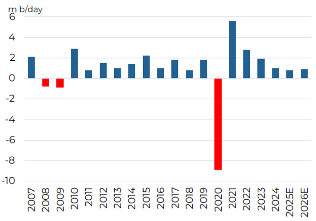 Strong non-OPEC supply growth, led by the United States, Brazil, Guyana and Canada. US shale production grew by around 0.3m b/day, supported by productivity gains despite ongoing capital discipline. Offshore Latin America was a major contributor, with Brazil’s pre-salt projects and Guyana’s Stabroek block delivering meaningful incremental volumes, while Canada benefited from efficiency gains in the oil sands. Overall non-OPEC supply growth reached approximately 1.6m b/day, contributing to the looser oil market balance.