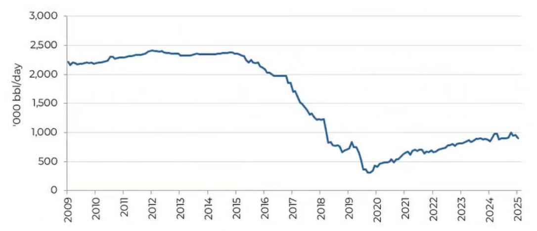 Venezuela’s oil production has fallen sharply over the past decade due to chronic under-investment, operational degradation, loss of technical capacity, and US sanctions. According to Bloomberg data, Venezuelan crude production averaged around 0.9m b/day in 2025, down from over 2.3m b/day in 2015, representing a decline of roughly 60%. Oil production troughed (ex-Covid) in 2022 at around 0.7m b/day, with the last three years bringing modest recovery, supported by partial sanctions relief and incremental operational improvements. The recovery has been fragile and heavily dependent on specific licences, diluent imports (which are imported from the US to allow Venezuela’s extra-heavy oil to flow), and export logistics. Currently, Venezuela accounts for approximately 1% of global oil supply.