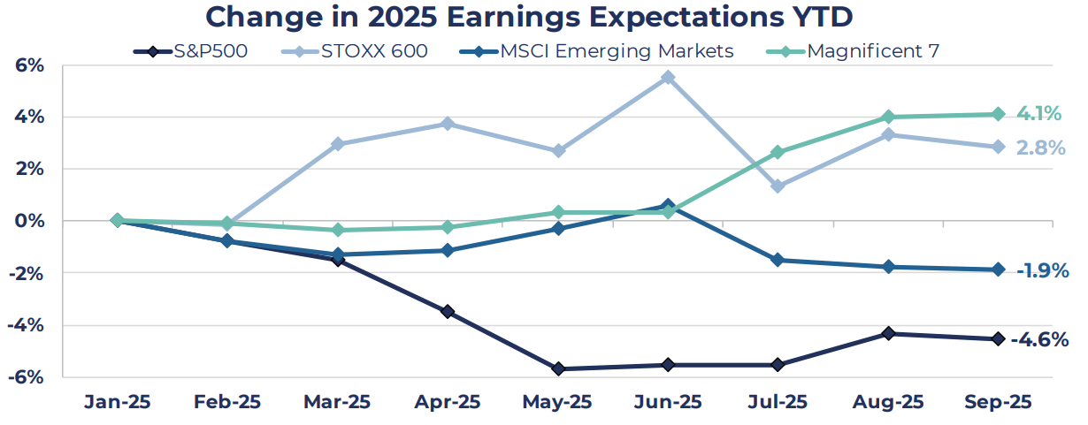 Within the US, equity performance continues to be disproportionately driven by the IT sector and the Magnificent Seven as Tesla, Alphabet, Apple, and Nvidia led the market higher. The Magnificent Seven's strong performance has been driven partly by a noticeable upward revision in 2025 earnings expectations. Analyst forecasts for 2025 group earnings per share have risen +4.1% since the start of the year. In contrast, earnings expectations for the broader S&P500 have fallen by -4.6%, highlighting the divergence in outlook between the Magnificent Seven and the rest of the index.
