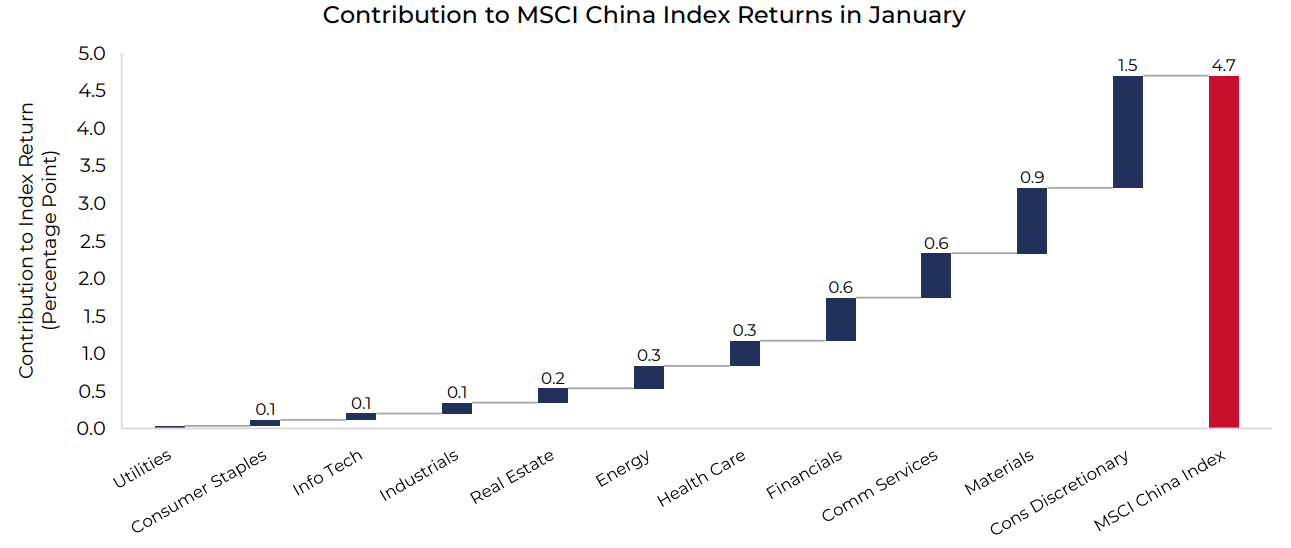 Chinese equities were strong in January as Consumer Discretionary stocks outperformed (led by Alibaba, which introduced new features) and Communication Services stocks rose on the prospect of rising AI demand. Materials stocks benefited from the rise in metal prices including gold.