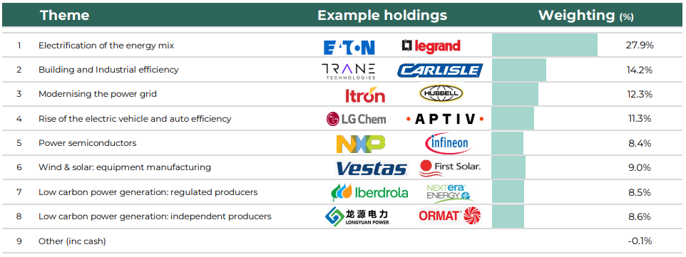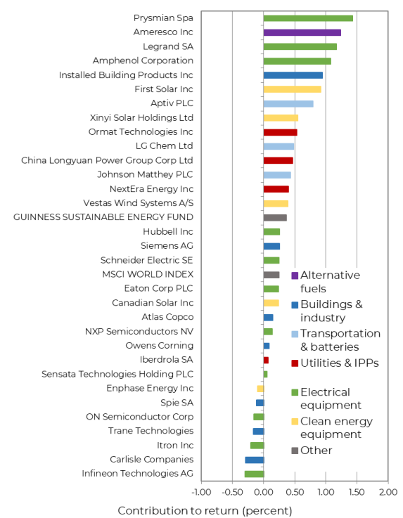 Performance in the third quarter reflected improving trends across a number of different subsectors and end markets within the sustainable energy industry. The Guinness Sustainable Energy portfolio is exposed to a range of different themes covering the supply of sustainable energy, the electrification of demand and the expansion and upgrading of global power grids.