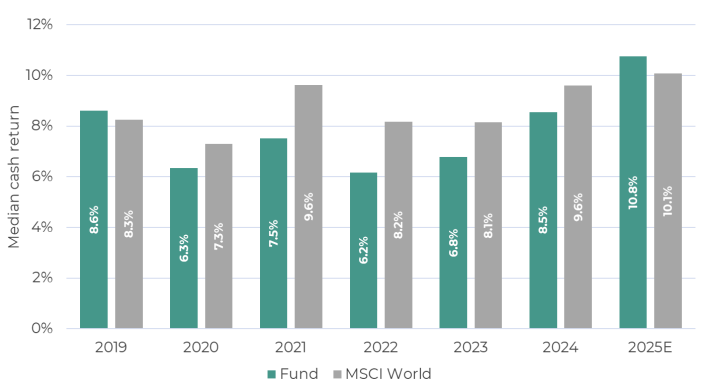 The cash return of the fund’s holdings (a measure of real economic return on capital employed) has also moved higher over 2024 and 2025 and has now reached nearly 11%, for the median holding at the end of September 2025. This is the result of improvements in the cash returns of various existing investee companies, plus some high grading of the portfolio. Looking back over the fund’s history, cash returns are now at a peak level and, for the first time since 2019, they are at a premium to the median cash return of the MSCI World index.