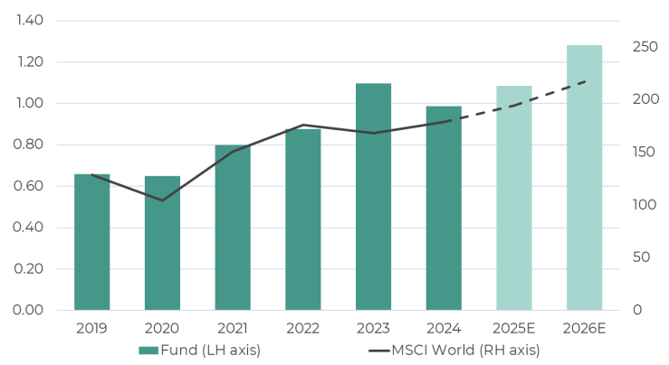 A clearer policy outlook, the expectation (and subsequent delivery) of the start of an interest rate easing cycle and the sharp uptick in electricity demand related to AI and data centres meant that 2025 and 2026 earnings expectations for the fund increased over the quarter. A return to positive earnings momentum is a key positive catalyst for the fund, which is projected on consensus estimates to deliver earnings growth in 2025 in excess of the MSCI World Index. Looking back, the fund has delivered earnings-per-share (EPS) growth in excess of the MSCI World (8.4% per annum from 2019-2024 versus the MSCI World at 6.8% per annum) and, based on current consensus expectations, it should return to that trend again. Including recent 2Q 2025 results, fund EPS is expected to grow at 14% per annum to 2026 (reflecting 10% growth in 2025 and 18% in 2026) while the MSCI World is expected to grow at 10.1% per annum to 2026 (reflecting 9% growth in 2025 and 11% in 2026).