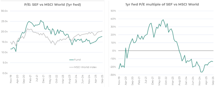 The positive return in the quarter led to the 12-month forward price/earnings ratio of the fund increasing over the quarter from 16.9x to 17.7x (+5%) and the outperformance took the fund to a 12-month forward P/E discount of 13% versus the MSCI World (versus a 15% discount at the end of June). Since the end of 2022, the P/E of the fund has compressed by 8% (from 19.1x to 17.7x) while the MSCI World has inflated from 15.5x to 20.4x, an increase of 32%.