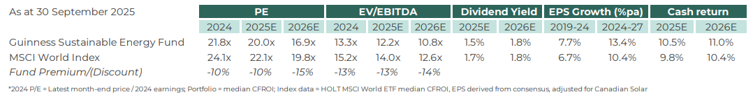 We have seen further continued improvement in the sustainable energy sector in the third quarter of 2025 resulting from increasing global electricity demand, a better-than-expected resolution to US clean energy policy and supportive policy elsewhere in the world. This backdrop is better than anything that we have seen in the last 24 months. Improvements in quality and diversified exposure to better structured end markets should allow fund earnings to grow in 2025 and 2026 and bring greater confidence in the longer-term earning potential. We believe that our basket of sustainable energy equities provides attractive exposure to earnings growth in excess of the MSCI World at a valuation discount to the MSCI World.