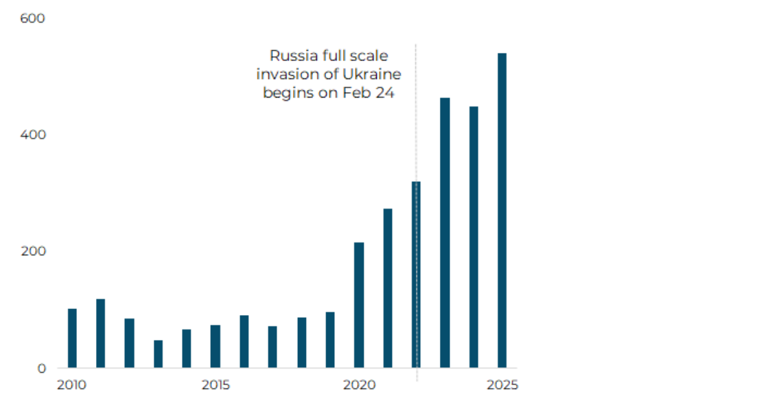 In certain European markets, the invasion also spurred major investment into both onshore and offshore wind generation. Germany, for example, reformed its permitting for onshore wind and has seen installations increase from 2 GW in 2021 to an expected 10 GW in 2026. As a result of these investments into renewable energy technologies, Europe has seen its share of power generation from wind and solar increase from 19% to 30% while gas has fallen from 19% to 17%.