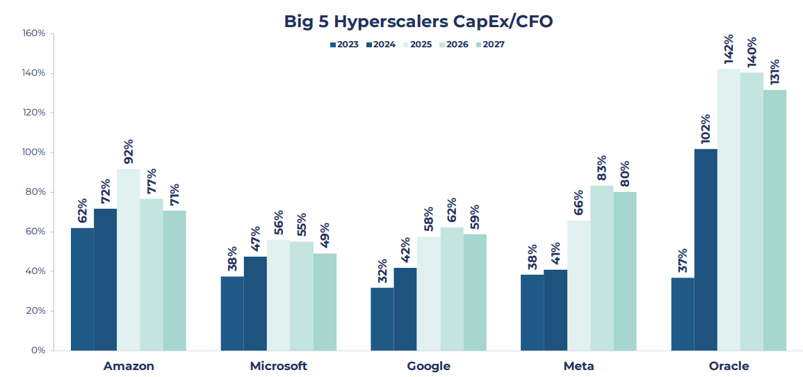 But there are reasons to still be optimistic. First, unlike previous investment cycles which have been more fuelled by debt and equity, much of the current build-out is being funded by free cash flow, a more sustainable and less systemically risky source. The chart below shows that, excluding Oracle, the other four hyperscalers can fund the forecast CapEx entirely out of their cash from operations.
