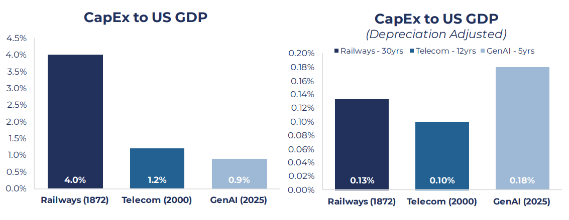 Some estimates put the overall AI CapEx spend at c.0.9% of US GDP (assuming c.70% of announced CapEx is spent in America). As shown by the chart below, this is a manageable figure when comparing to previous infrastructure investment cycles, particularly the railway and telecom build-outs, which ran at roughly 4% and 1.2% respectively.