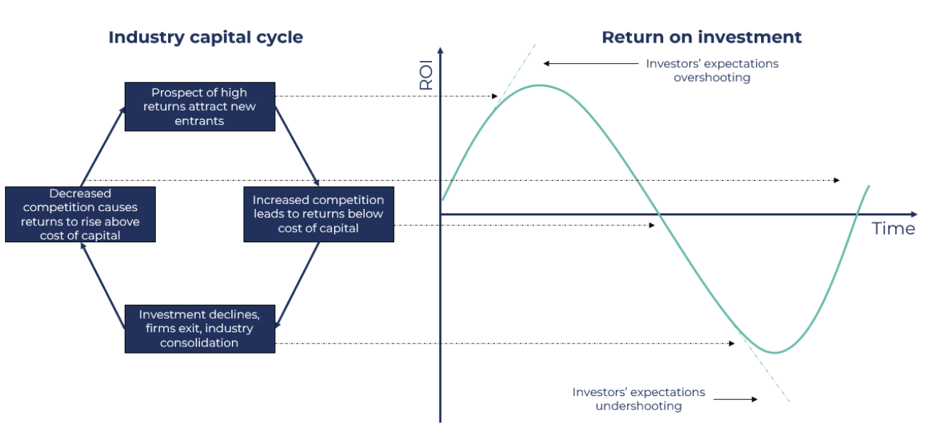 An acceleration in the infrastructure build-out by hyperscalers and neoclouds (cloud providers built specifically for AI and high-performance computing workloads) puts us in the phase of the capital cycle characterised by strong demand and the prospect of outsized returns. This serves to draw in new capital and leads to intensifying competition.
