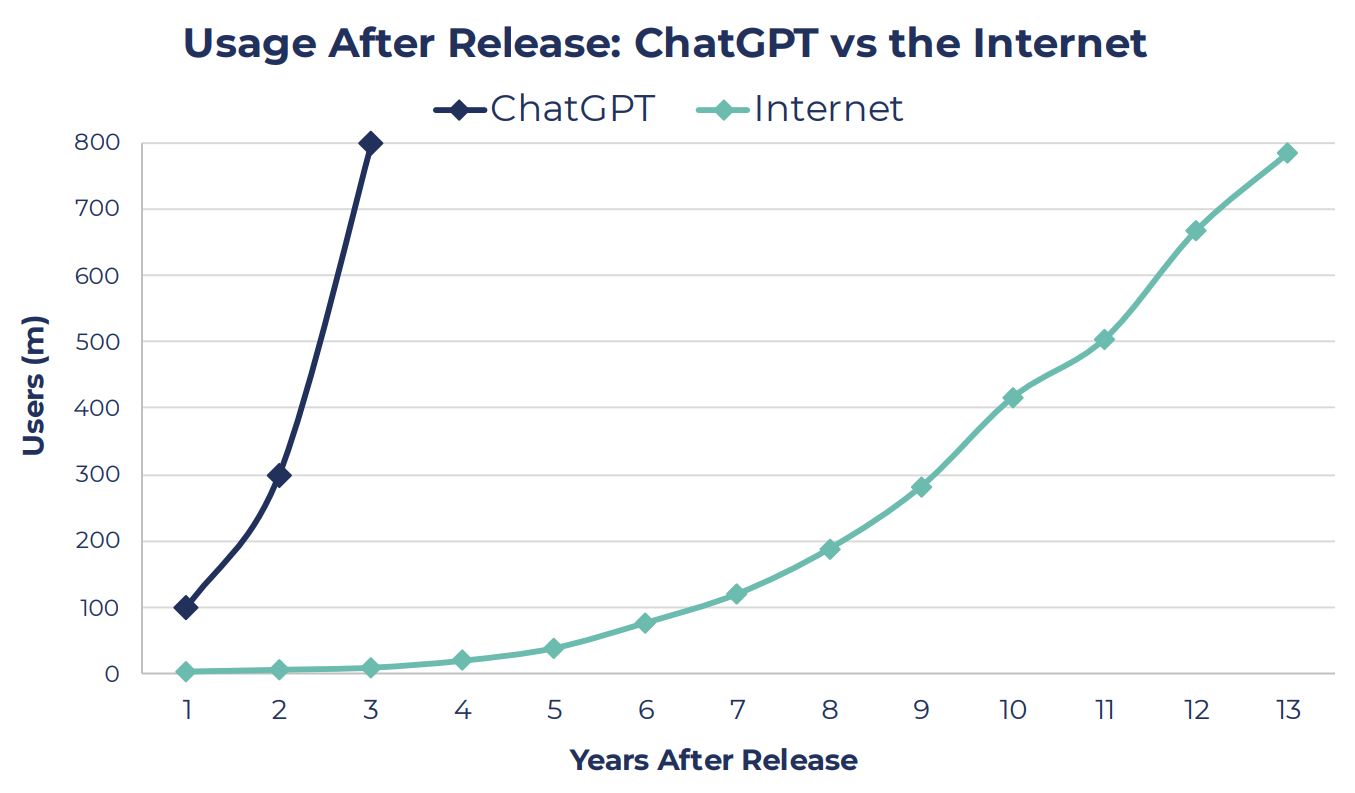 The chart below highlights the rapid adoption of large language models (LLMs), with ChatGPT weekly active users reaching c.800m just three years after launch, a milestone that took the internet 13 years to achieve. Even so, we remain in the early stages of AI adoption and considerable debate surrounds the full range of applications and use-cases.