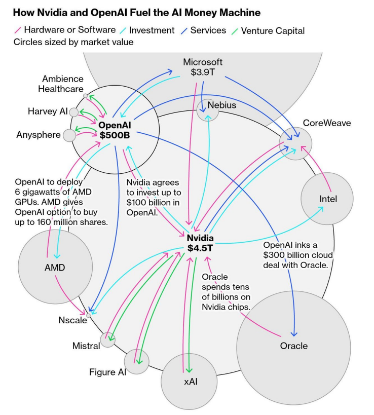 For example, AMD and OpenAI’s partnership saw the former agreeing to provide 6GW of GPUs and the latter issuing warrants for c.10% of the company in return (if certain purchase milestones are met). The news caused AMD's shares to jump 30%, more than offsetting the potential dilution and highlighting the euphoric market reaction to these creative circular deals. While some suggest these are more like frameworks, setting out a potential path forward as the AI build-out continues to ramp up, their size and quantum are starting to raise concerns.