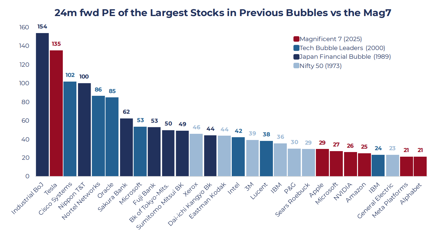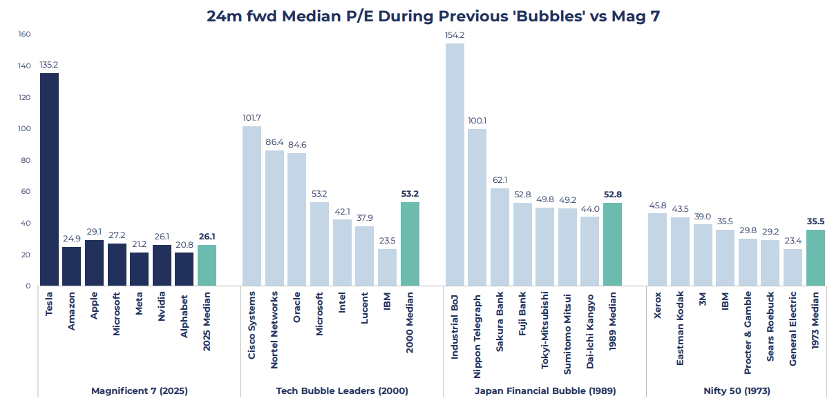 Today’s Magnificent 7 are at far more reasonable valuations than the seven largest index stocks in previous bubbles, three of which are shown below. Tesla remains the current outlier, with a 24-month forward price/earnings (PE) ratio over 135, but the other six are trading at justifiable levels given their growth and quality characteristics, with a median multiple of 26.1x.
