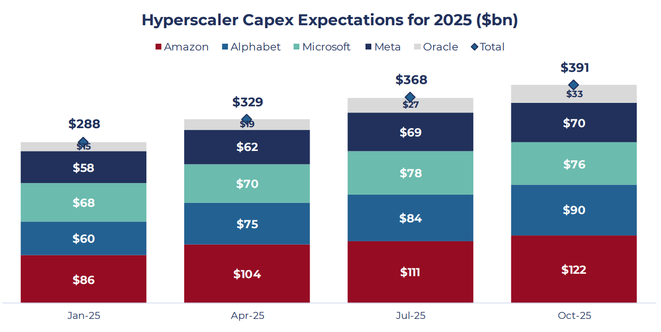 As shown in the chart below, hyperscaler CapEx expectations for 2025 have risen from $288bn at the start of the year to $391bn in October. This upward trend is expected to continue in 2026, as demonstrated by Meta’s CEO Mark Zuckerberg, who noted the firm’s 2026 CapEx would be “notably larger” than in 2025, a prediction made by many of the leading firms.