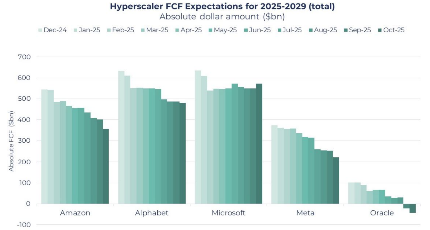 The shift is reflected in declining free cash flow expectations (see below) as rising AI infrastructure spend outpaces near-term earnings contributions. Oracle warrants a special mention, with the market currently predicting it will generate negative cumulative free cash flow over the 2025-2029 period.