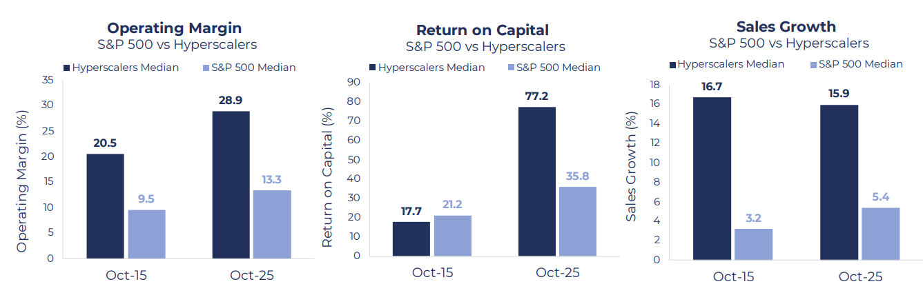Moreover, the big tech companies funding the build-out remain very high-quality compared to the average S&P 500 company. As shown below, these firms can afford to make aggressive forward-leaning investments, with strong operating margins, healthy returns on capital and a strong sales growth outlook to fund the spending.