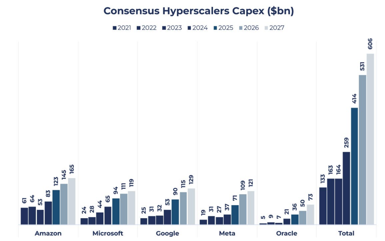 As a result, major technology firms have committed unprecedented capital to build out the infrastructure that has the potential to support this next technological advance. Capital expenditure by the five largest hyperscalers (firms which operate data centres and provide cloud computing) will exceed $400bn this year and half a trillion dollars next year, as shown by the chart below.