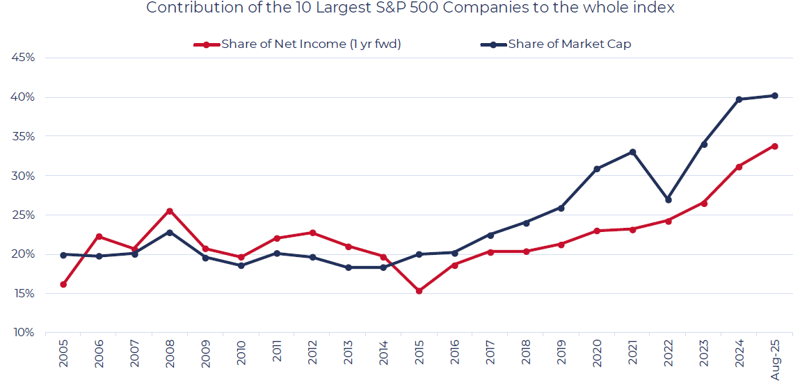 This increase in market concentration is a trend that actually emerged well before investors’ particular enthusiasm for generative AI, and may have even started between 2014 and 2016. Concentration in the S&P 500 is now at an all-time high, with the 10 largest companies in the index (hereafter referred to as the 'Top Ten’) now accounting for 40% of its total market capitalisation, roughly double the concentration seen in 2015/2016 (c.20%). Still, this doesn’t make the c.10 percentage point increase in concentration in the Top Ten stocks between 2020-2025 any less staggering – or any less worrying, for some.