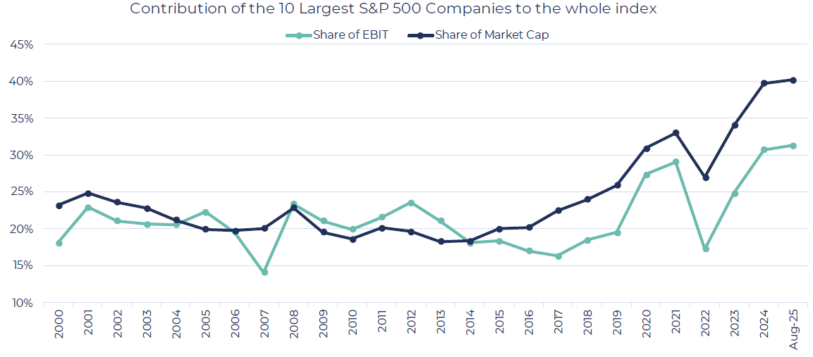 Still, there is a meaningful gap of c.10 percentage points (pp) between market cap concentration and earnings concentration. However, 12-month trailing EBIT is a backwards-looking metric. Using forward estimates for net income (1-year forward consensus estimates), the earnings share increases from less than 20% in 2015-2016 to c.34% in August 2025. A gap of c.6pp still remains.