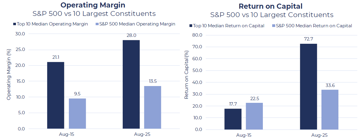 From a quality perspective, despite already having a superior margin profile compared to the rest of the S&P 500, the Top Ten saw greater margin improvement than the rest of the index between 2015 and 2025. The ‘median’ operating margin of the Top Ten increased by c.7pp, whilst the median stock in the index increased by just c.4pp. On a returns basis, the improvement was even more vast. At the beginning of the period, return on capital between the two groups looked relatively similar. Now, however, the median Top Ten stock has a return on capital over double that of the rest of the index, increasing from 18% to 73%, an increase of c.55pp, while the average S&P 500 company increased just c.11pp, to c.34%.