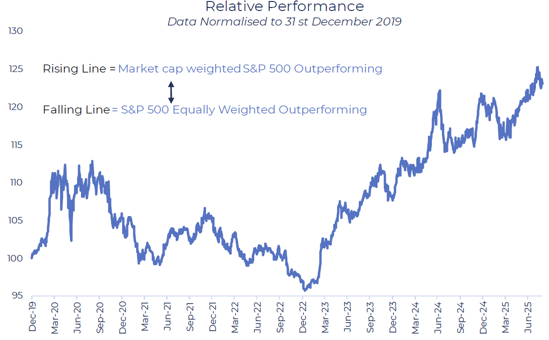 The Magnificent Seven’s market leadership has outlasted even the most bullish of expectations and numerous ‘false dawns’ when the end seemed in sight. In August, however, weakness in the mega-caps created space for broader market participation after the release of an MIT report suggesting that corporate AI pilots had not yet translated into revenue growth, and the equal-weight S&P 500 outperformed its market-cap-weighted counterpart. This divergence served as a reminder that the dominance of a few stocks not only elevates concentration risk but can also leave investors vulnerable to abrupt reversals when sentiment toward those leaders turns.