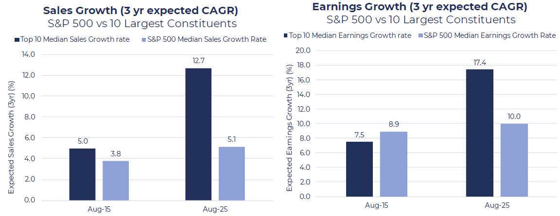 It is not just quality attributes that have underpinned the increase in this ‘gap’, however. Looking at both expected sales and earnings growth, in August 2015, the Top Ten largest constituents looked very similar to the rest of the S&P 500. While both the Top Ten and the broader index now have a superior growth outlook, sales for the Top Ten are now expected to grow at c.2.5x the rate (12.7% vs 5.1%) over the next three years than the rest of the index, and earnings at c.1.7x the rate.