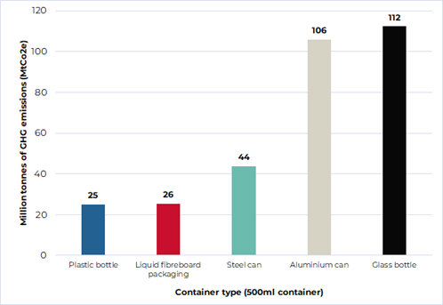 Plastics often perform favourably compared to alternatives at the manufacturing stage. A 2019 study by Imperial College London examined the production-phase emissions that would have been incurred if every 500ml PET bottle produced globally in 2016 had been made from alternative materials. As shown below, plastics performed well in these terms against common alternatives.
