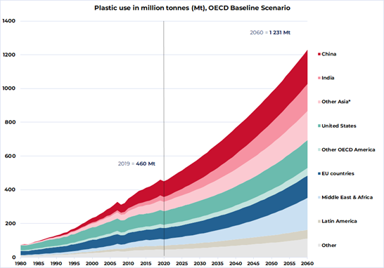 The OECD expects global plastics use to continue rising as population growth and improving living standards drive higher consumption. Demand is likely to be strongest in emerging Asian and African economies as they close the consumption gap with higher-income countries. In its 2022 Global Plastics Outlook, the OECD estimates plastic use will almost triple to 1,231 million tonnes (Mt) in 2060 (up from 460 Mt in 2019). Growth is expected to be driven primarily by packaging, construction and transport.